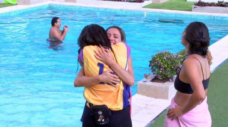 chora abraçada a no BBB 24. A sister deixou a Prova do Líder de Resistência ao lado de . "Não era para ser, mas vai ser", diz a vendedora. "Parabéns, amiga, você arrasou muito", responde a bailarina.